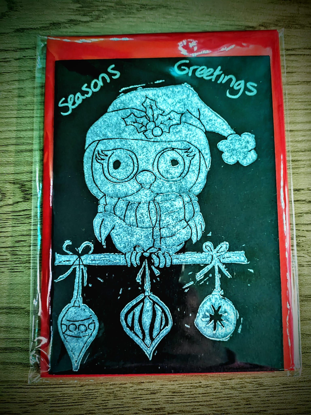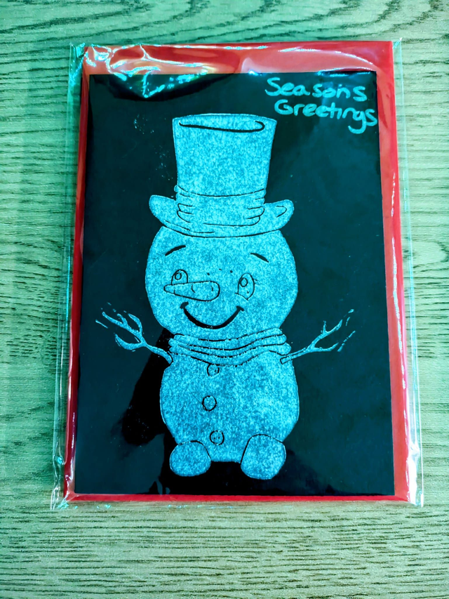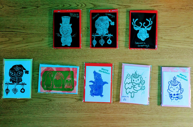 These are black and white lino printed christmas cars, they come in a random pack of three.
