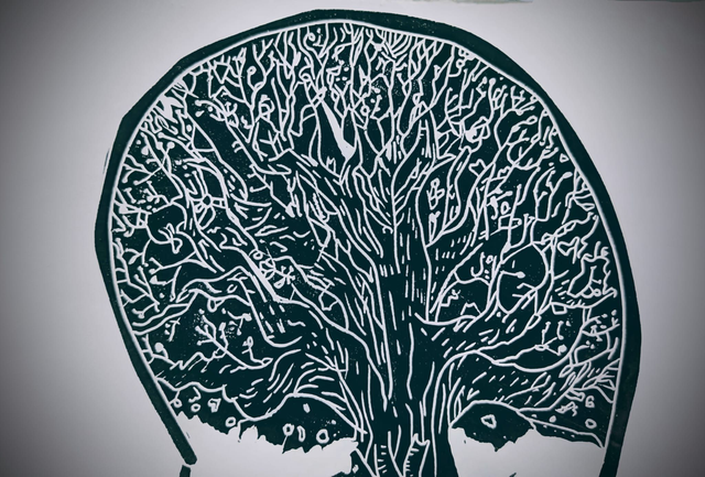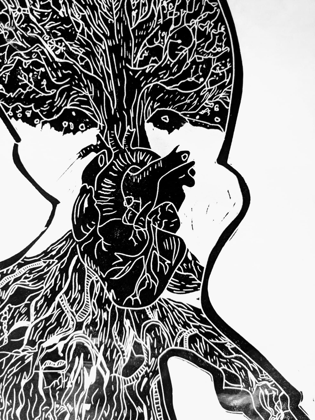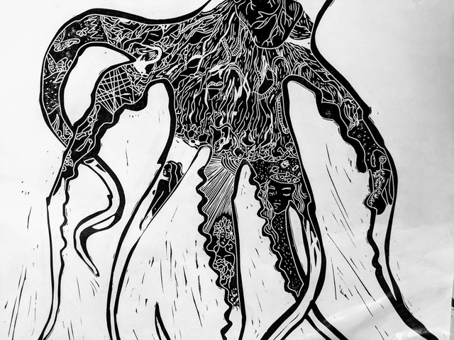 This is an A3ish lino print mounted on an A2 card frame. It's one of my favourites. I love art in which the more you look, the more you see.