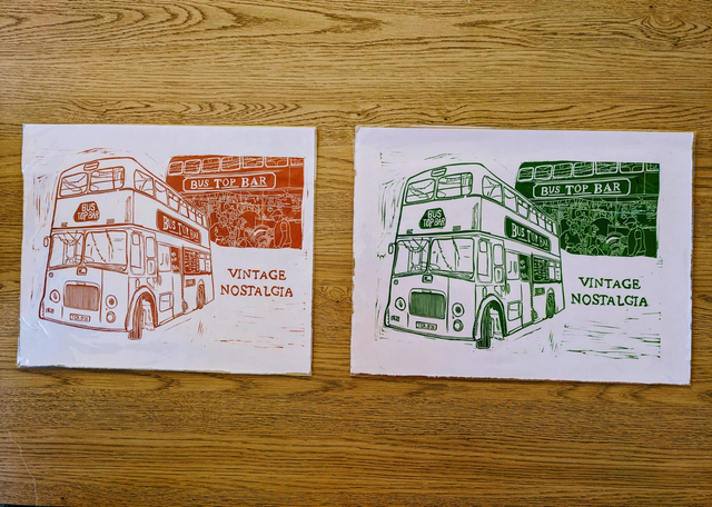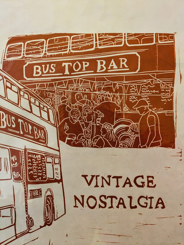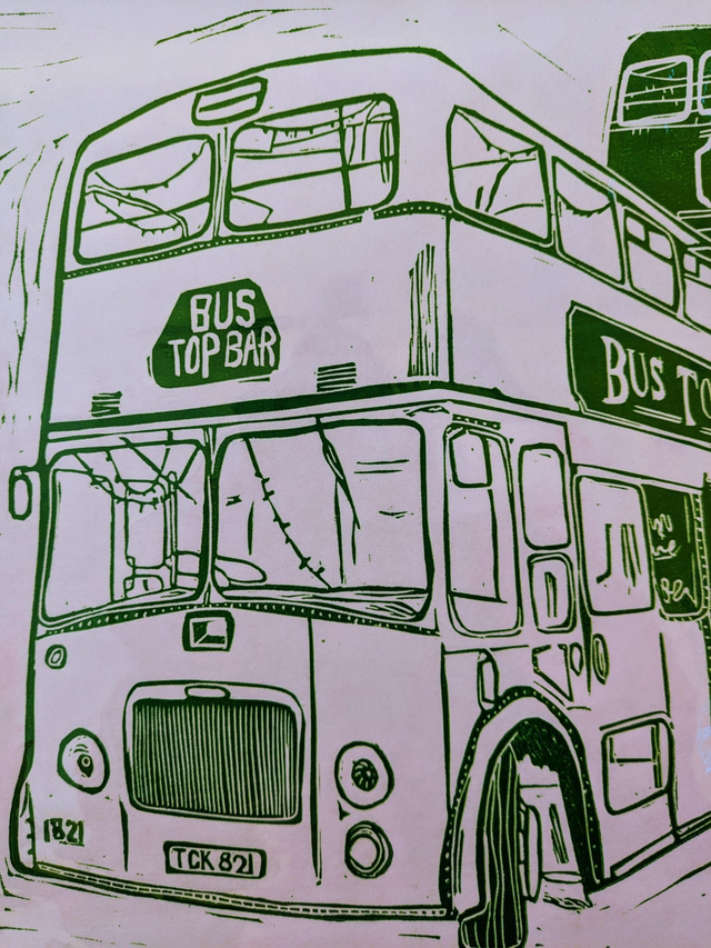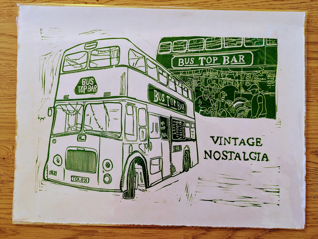This was inspired by a beautiful bus top bar we visited at a festival, the staff were brilliant, the owner was lovely and the vibes were super chill. This lino print is mounted in an A3 card frame.